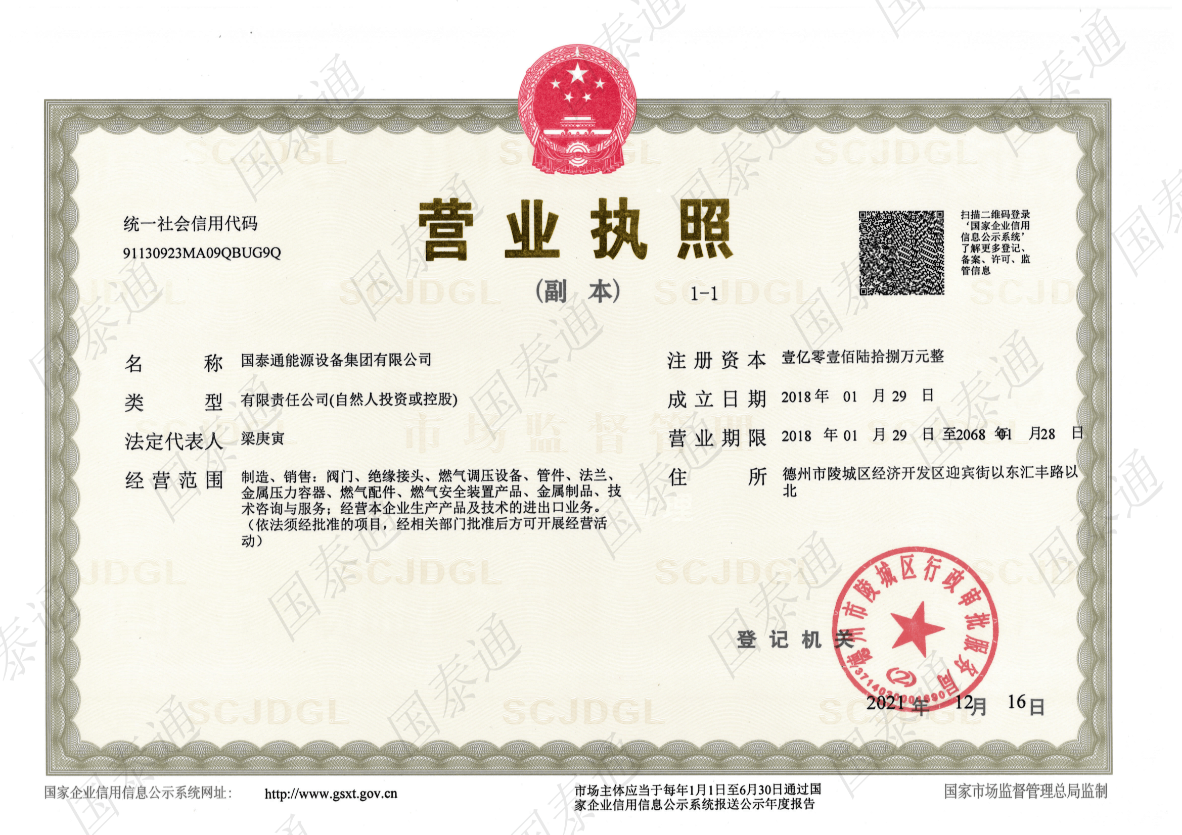 國泰通能源設備集團有限公司是一家國家級高新技術企業(yè),專注于閥門和燃氣調(diào)壓輸配設備設計、研發(fā)、生產(chǎn)、銷售、服務于一體的系統(tǒng)集成解決方案服務商。公司成立于2011年,注冊資金10168萬元,擁有北京運營中心和山東生產(chǎn)中心兩大基地,北京運營中心主要承擔集團公司的戰(zhàn)略規(guī)劃發(fā)展,山東生產(chǎn)基地承擔集團公司產(chǎn)品研發(fā)、生產(chǎn)和銷售服務,集團公司山東生產(chǎn)基地占地面積5萬余平方米,總建筑面積3萬余平方米,有著現(xiàn)代化的廠房和辦公大樓。集團公司經(jīng)過十多年的茁壯發(fā)展,現(xiàn)擁有中、高級工程師27名,生產(chǎn)服務技術人員二百余人......